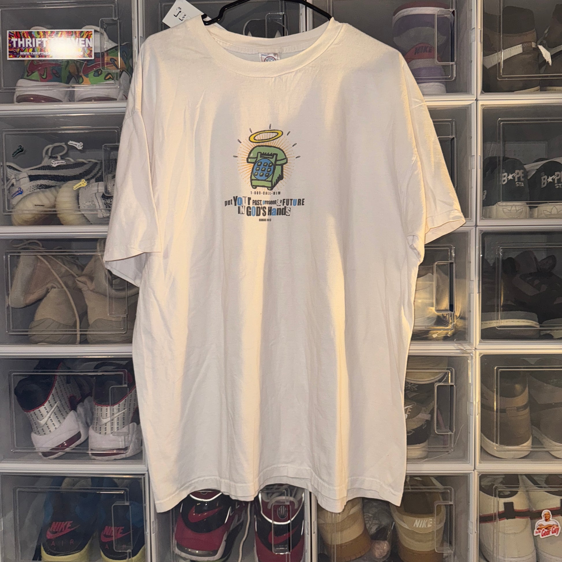 Vintage Jesus tee. Front reads Put your Past Present and Future in God's Hands. Back reads Friends Don't Let Friends Call Psychic "Friends"